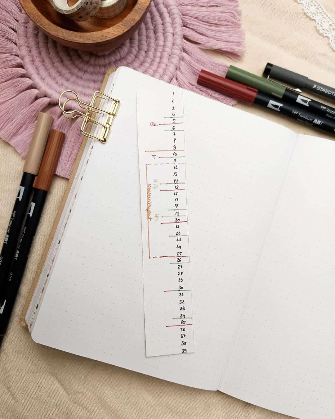 5. Positioniere die Linealstreifen zwischen den Innencover-Seiten (entweder auf der linken oder rechten Seite des Journals). Achte unbedingt auf die Übereinstimmung des Punkterasters zwischen deinen leeren Journalsseiten und dem Lineal!