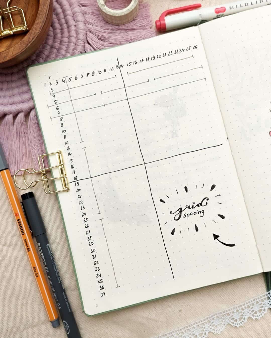 Der Begriff »grid spacing« bedeutet Rasterabstand. Damit ist das Punktrastersystem der »dotted Journals« gemeint, welches je nach Marke unterschiedlich ausfallen kann. Gezählt werden die Zwischenräume der Punkte. Die meisten Punktraster haben einen Abstand von 5 mm, was bei den A5 Journals ein Raster von 39 Kästchen Länge und 26 bis 28 Kästchen Breite ergibt. Es können immer Unterschiede auftreten, weshalb es wichtig ist sich zunächst mit dem Punktrastersystem des Journals vertraut zu machen.